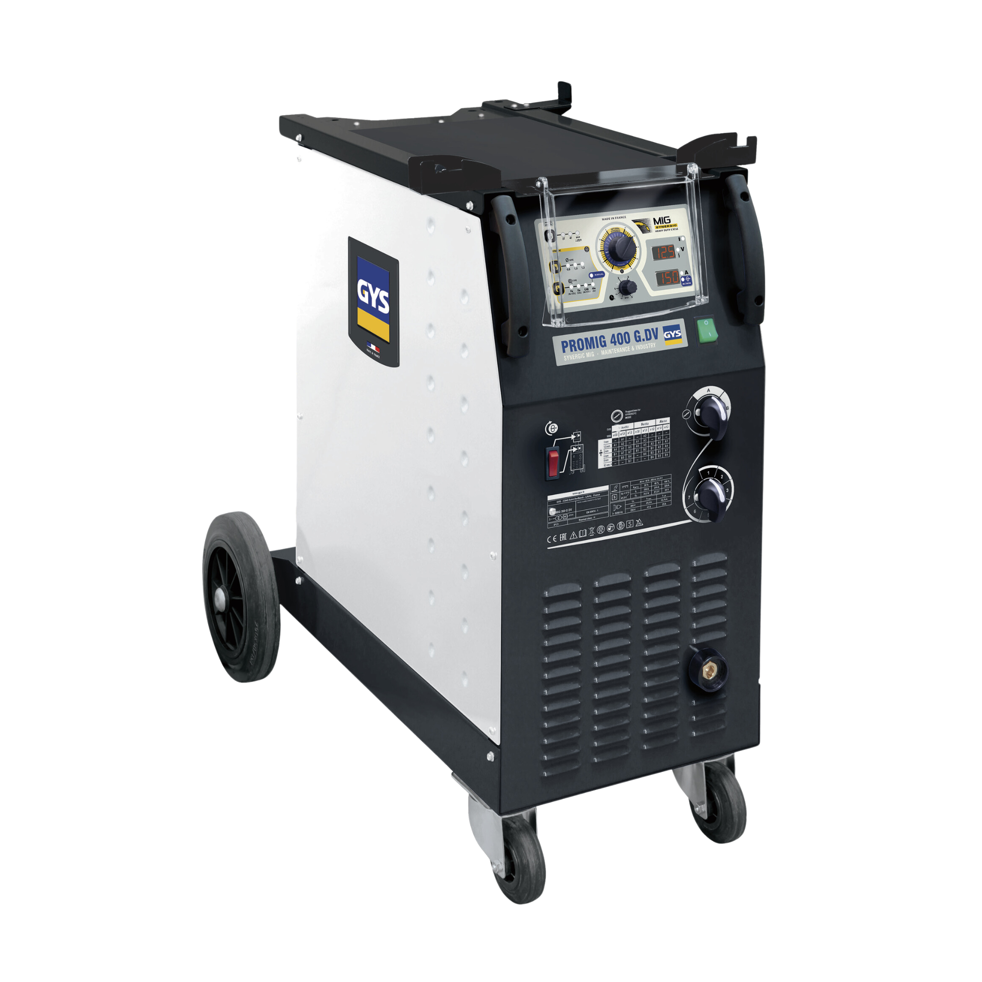 The PROMIG 400DGV three-phase "synergistic" welding machine ideal for semi-industrial production, truck maintenance workshops and locksmithing. Equipped with its separate hose reel, the PROMIG 400G is recommended for professional work up to ø1.2 mm, on steel, stainless steel and aluminum. Thanks to its synergistic mode, its adjustment is quick and easy.