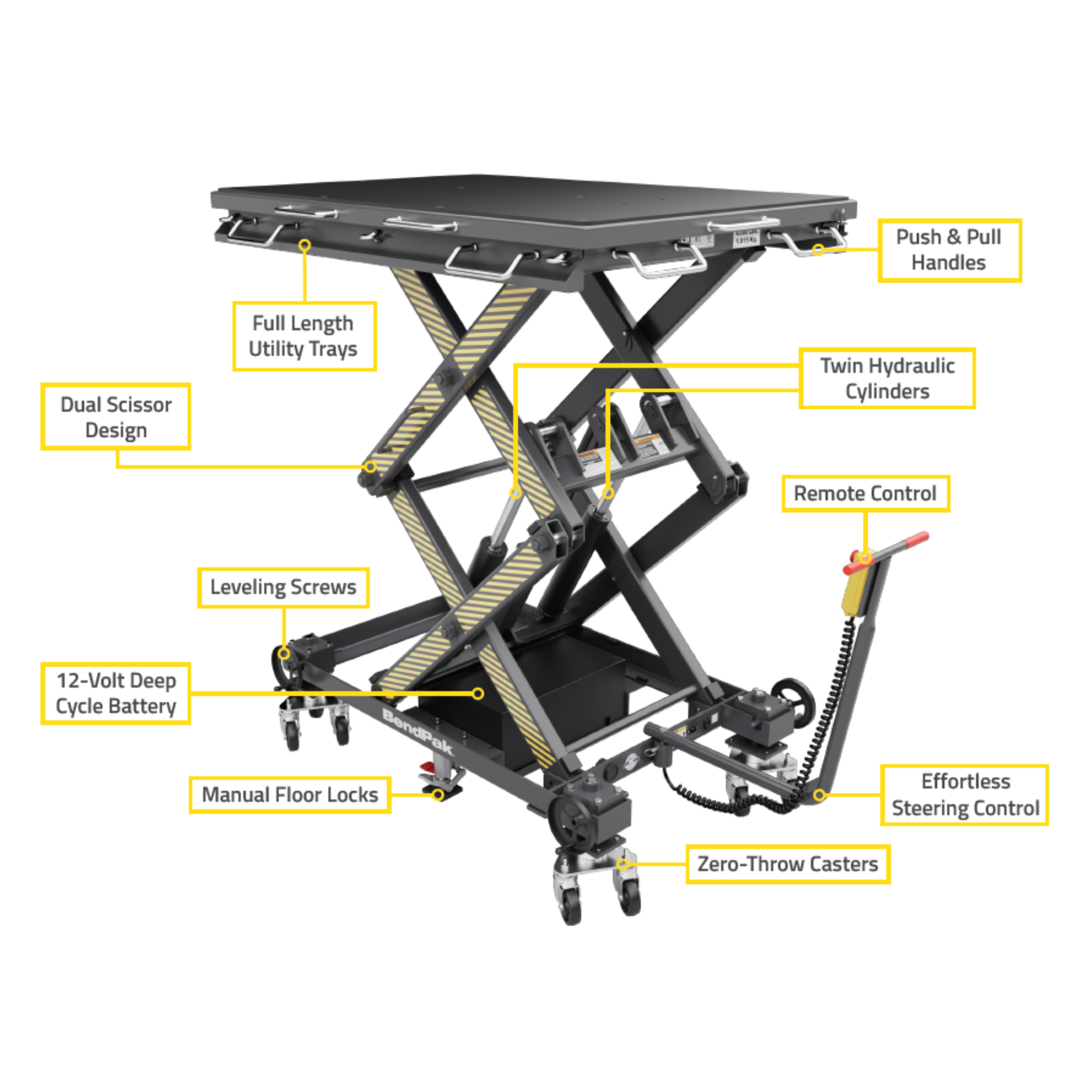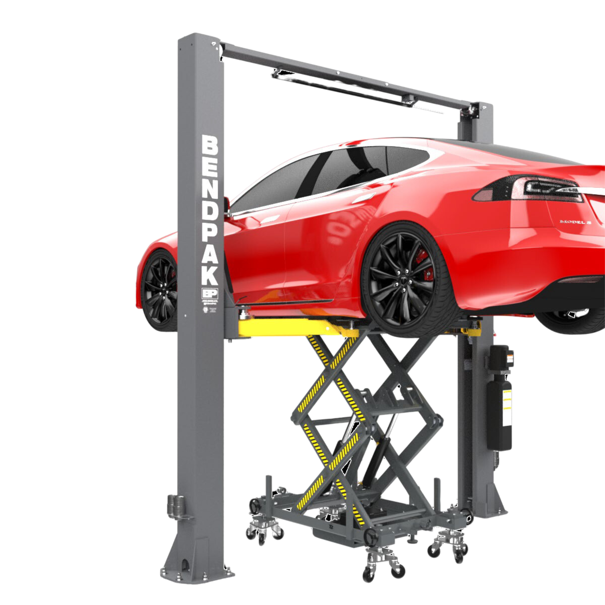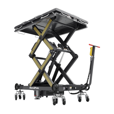 BendPak’s revolutionary Mobi-EVS™ line of full-rise battery powered mobile scissor lift tables are perfectly suited for Electric Vehicle Service and EV Battery Pack replacement. With their compact design, these space-saving lift tables can be easily transported anywhere in the workplace, making them ideal for multi-bay facilities or workplaces with confined areas.
