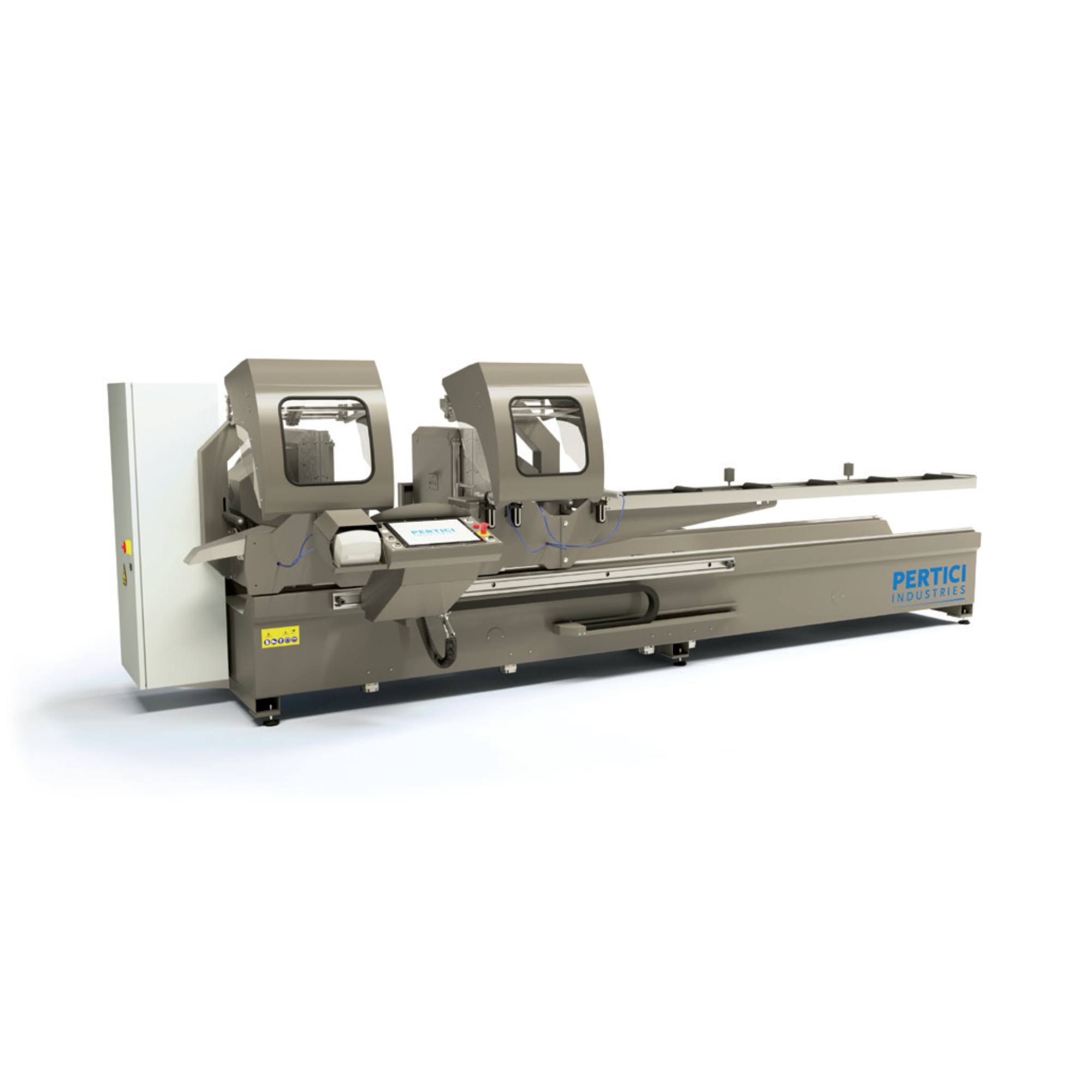 The Pertici 500D2K is a high-performance electronic double-head cutting machine designed for the precise cutting of aluminum and PVC profiles. Equipped with 500 mm carbide blades, this system offers excellent cutting quality, advanced automation, and operator-friendly controls.
