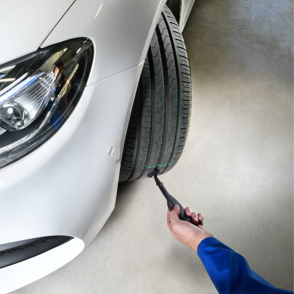 LASER EXAMINER 2 has a special magnetic head allowing it to rapidly measure the depth of tread left. Once positioned on the tire, it projects a laser beam over the surface to provide an objective measurement.
